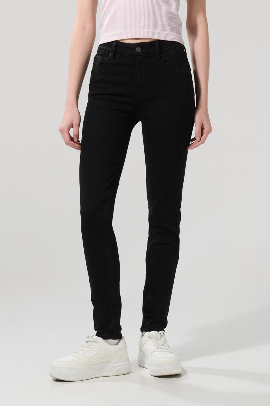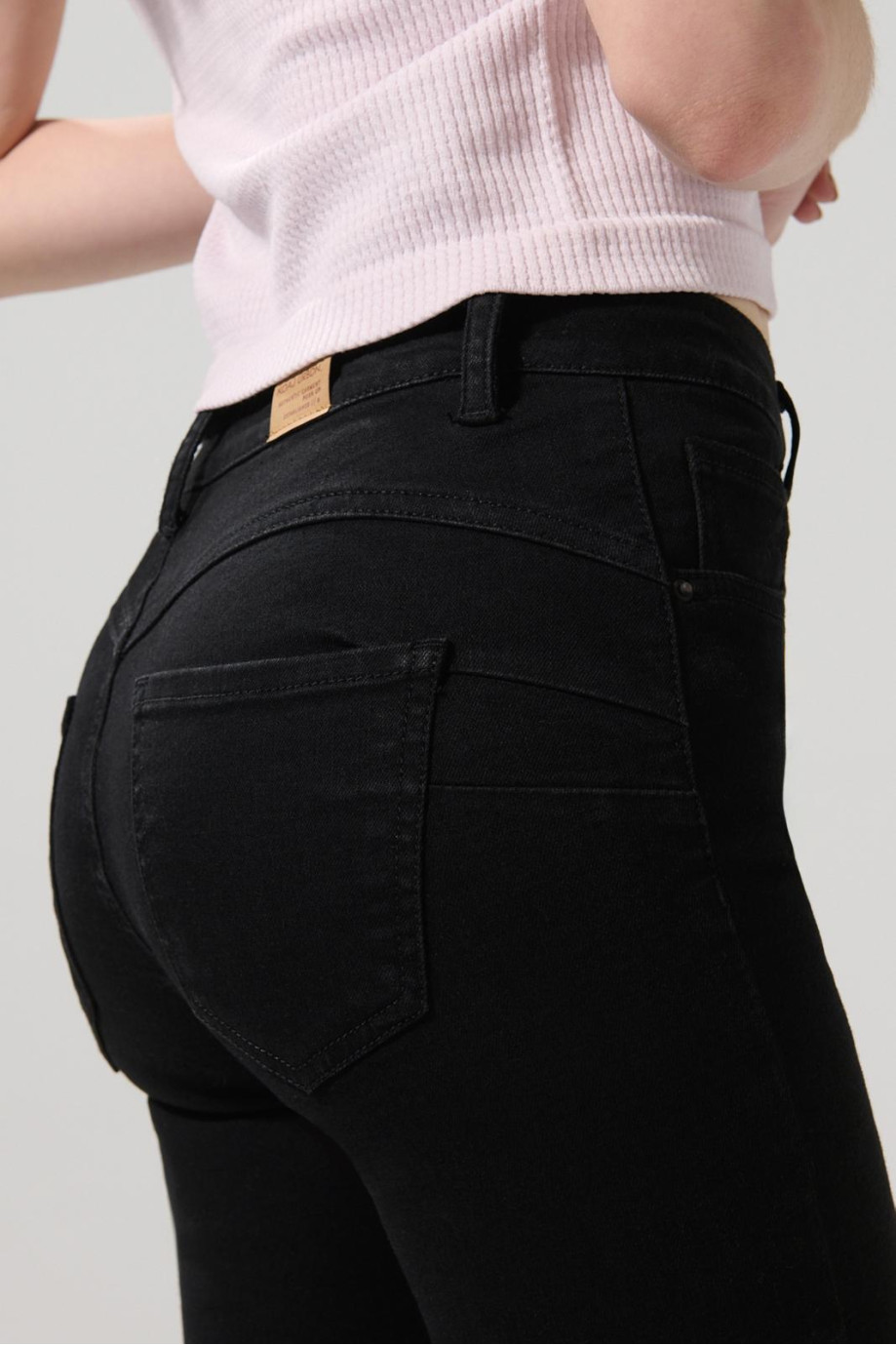 Jean negro push up para mujer cuenta con realce posterior con pinzas, pretina sencilla con botón metálico, 5 bolsillos, tiro alto y una silueta ajustada al cuerpo. Esta será una prenda infaltable que deberás llevar a tus planes diarios. ¡Con una blusa blanca estampada crearás un outfit minimalista!