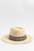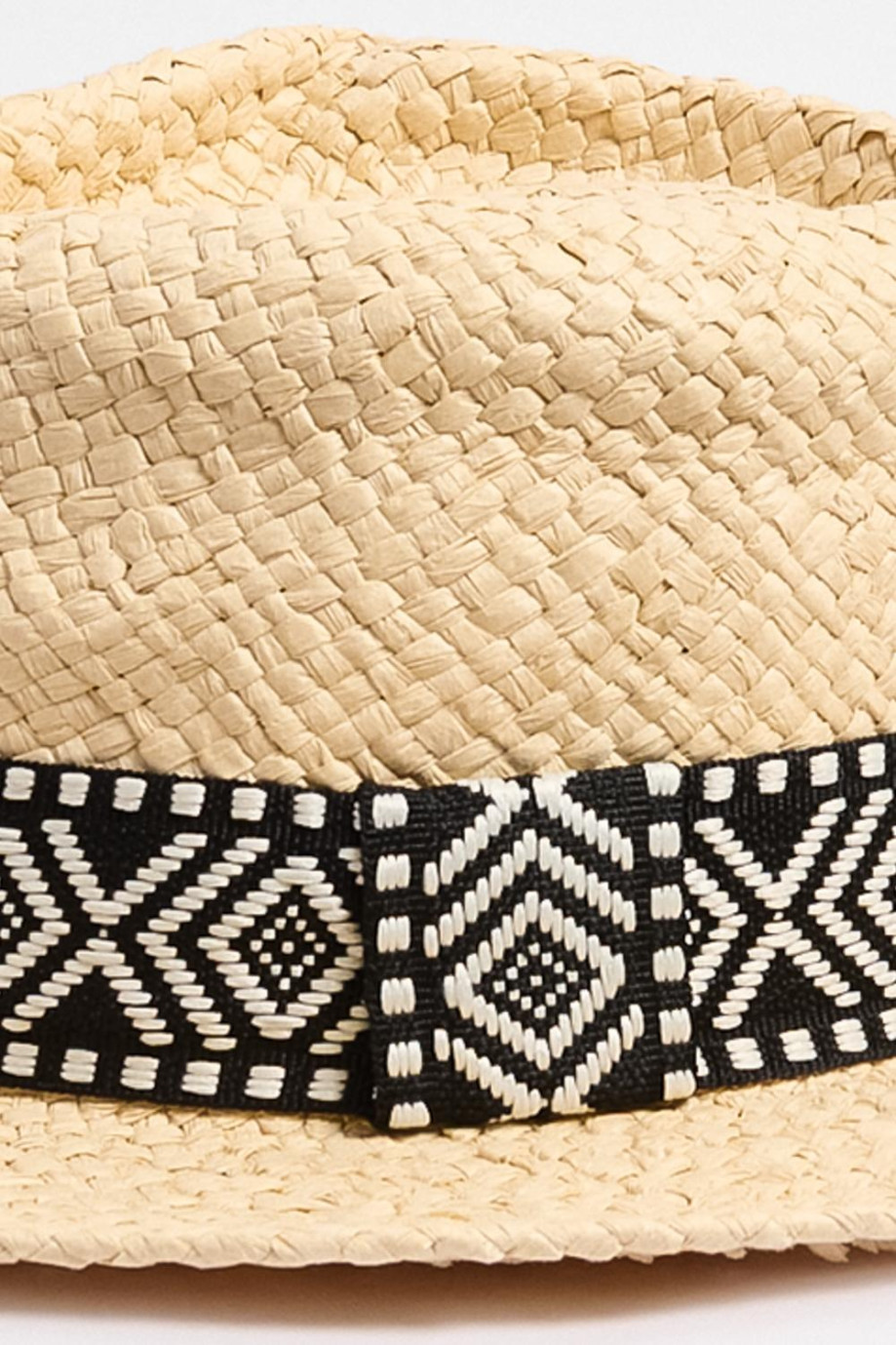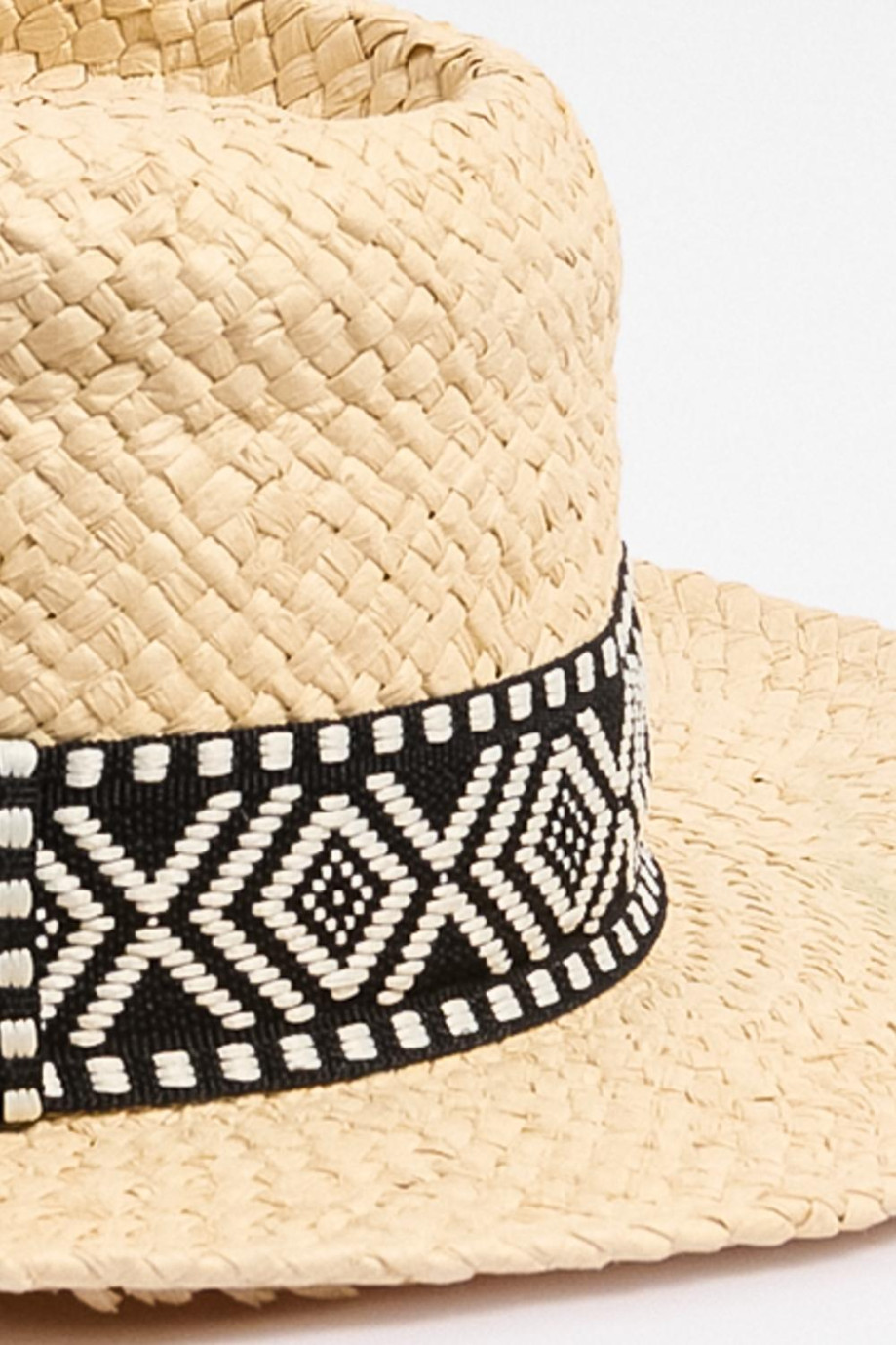 Sombrero crema claro Panamá para hombre cuenta con ala corta plana, cinto decorativo con diseños tribal en contraste y corona con forma asimétrica. Despreocúpate del sol con este accesorio, un infaltable que podrás lucir con camisetas KOAJ de diferentes estilos.