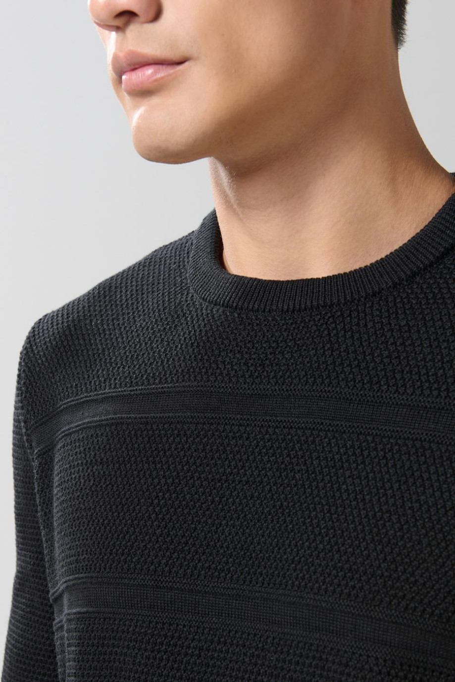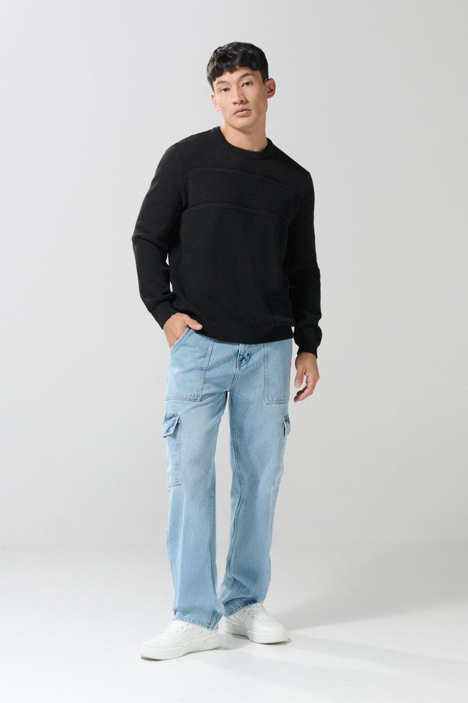 Suéter para hombre en tono negro, confeccionado en material tejido, cuenta con cuello redondo, manga larga, detalles en relieve localizados y un fit ajustado al cuerpo. Ideal para lucir con jeans, será el complemento que necesitas para sentirte cómodo en tus planes diarios o climas fríos.