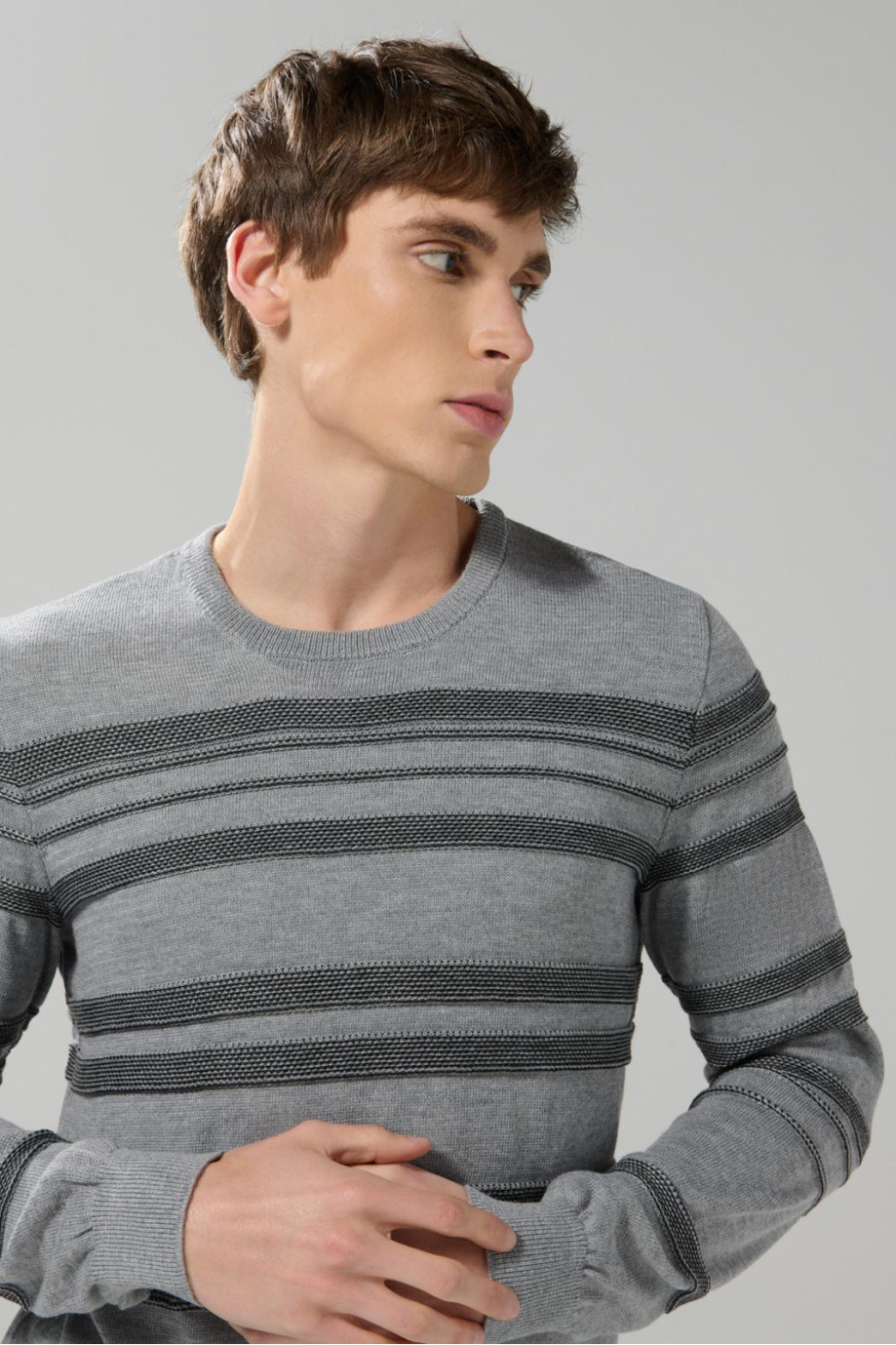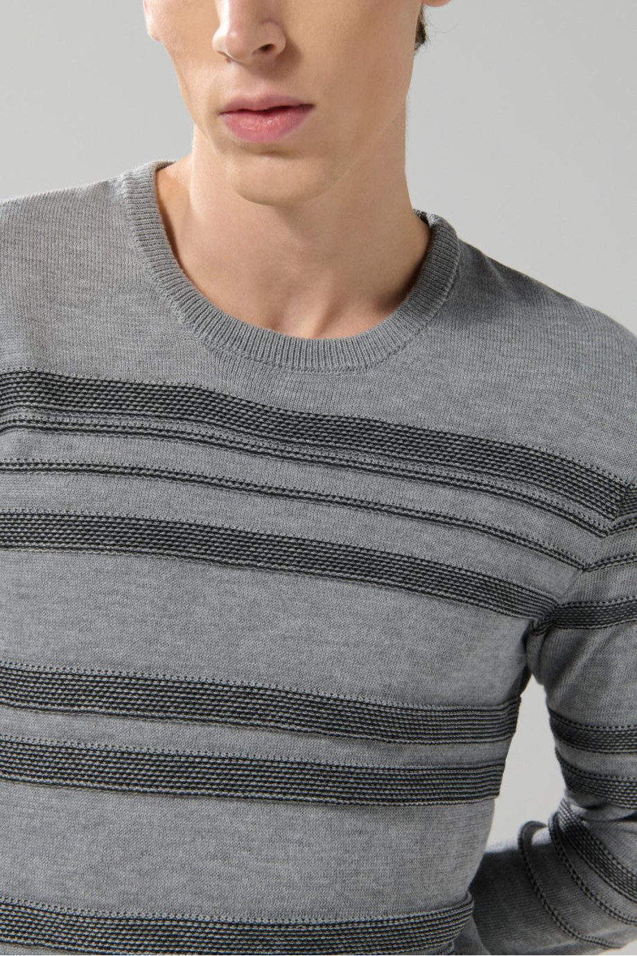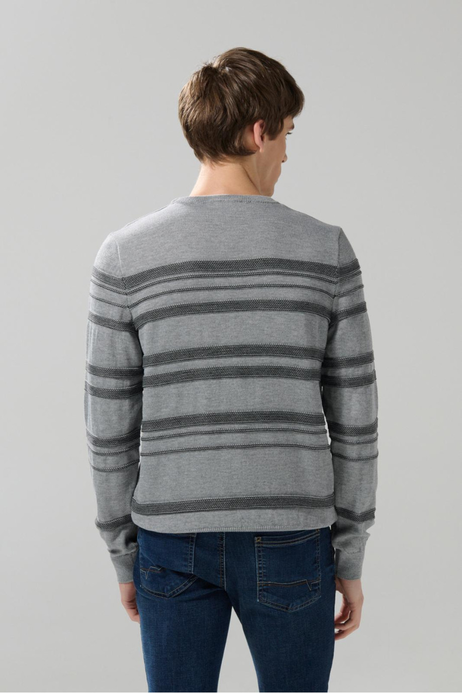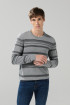 Suéter gris oscuro cuello redondo con rayas en contraste