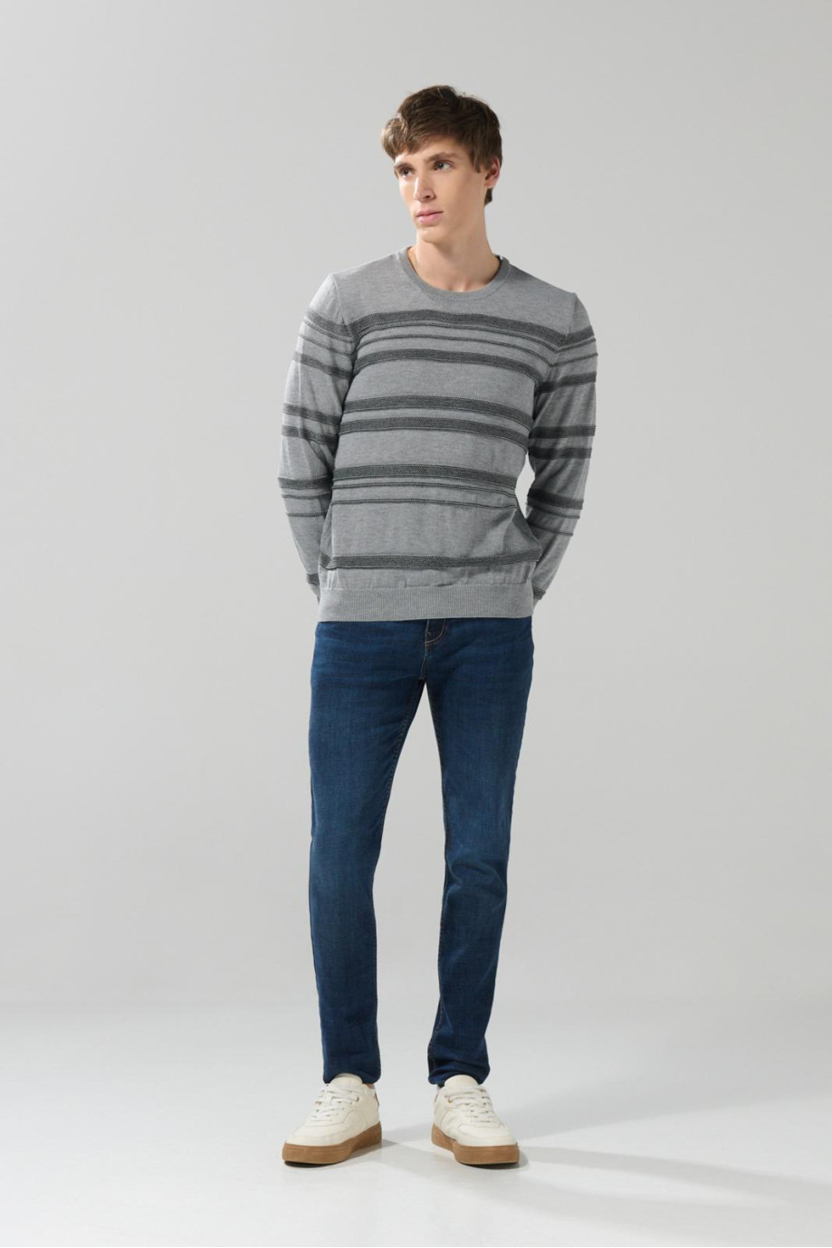 Suéter cuello redondo gris oscuro para hombre, elaborado en suave material tejido, cuenta con diseños de rayas en contraste, manga larga y una silueta ajustada en el cuerpo. Infaltable para los climas fríos, podrás combinarlo con tu mejor jean y crear un look de ensueño con el que te destacarás.