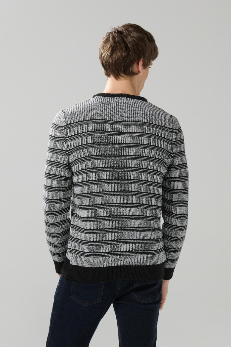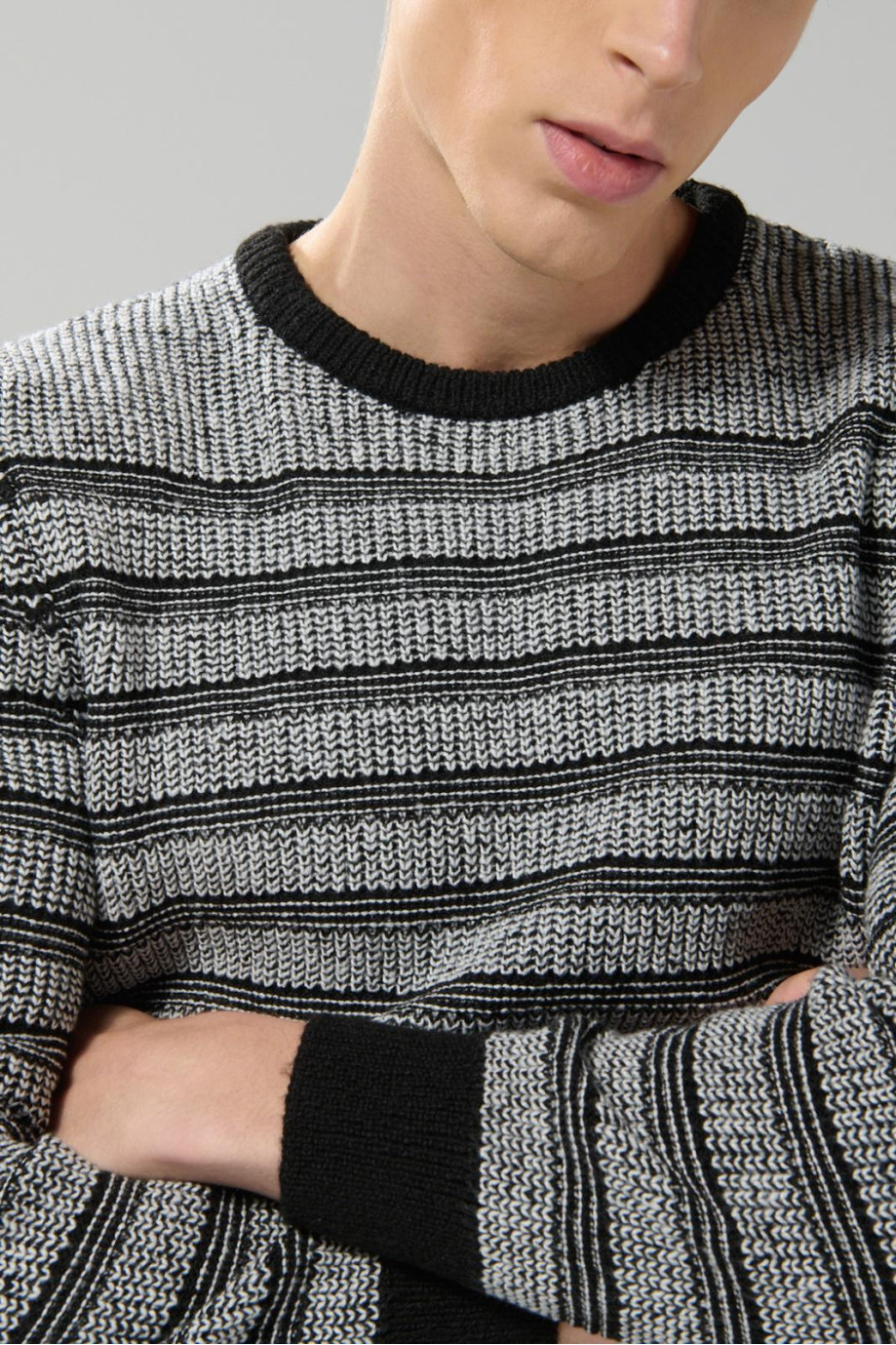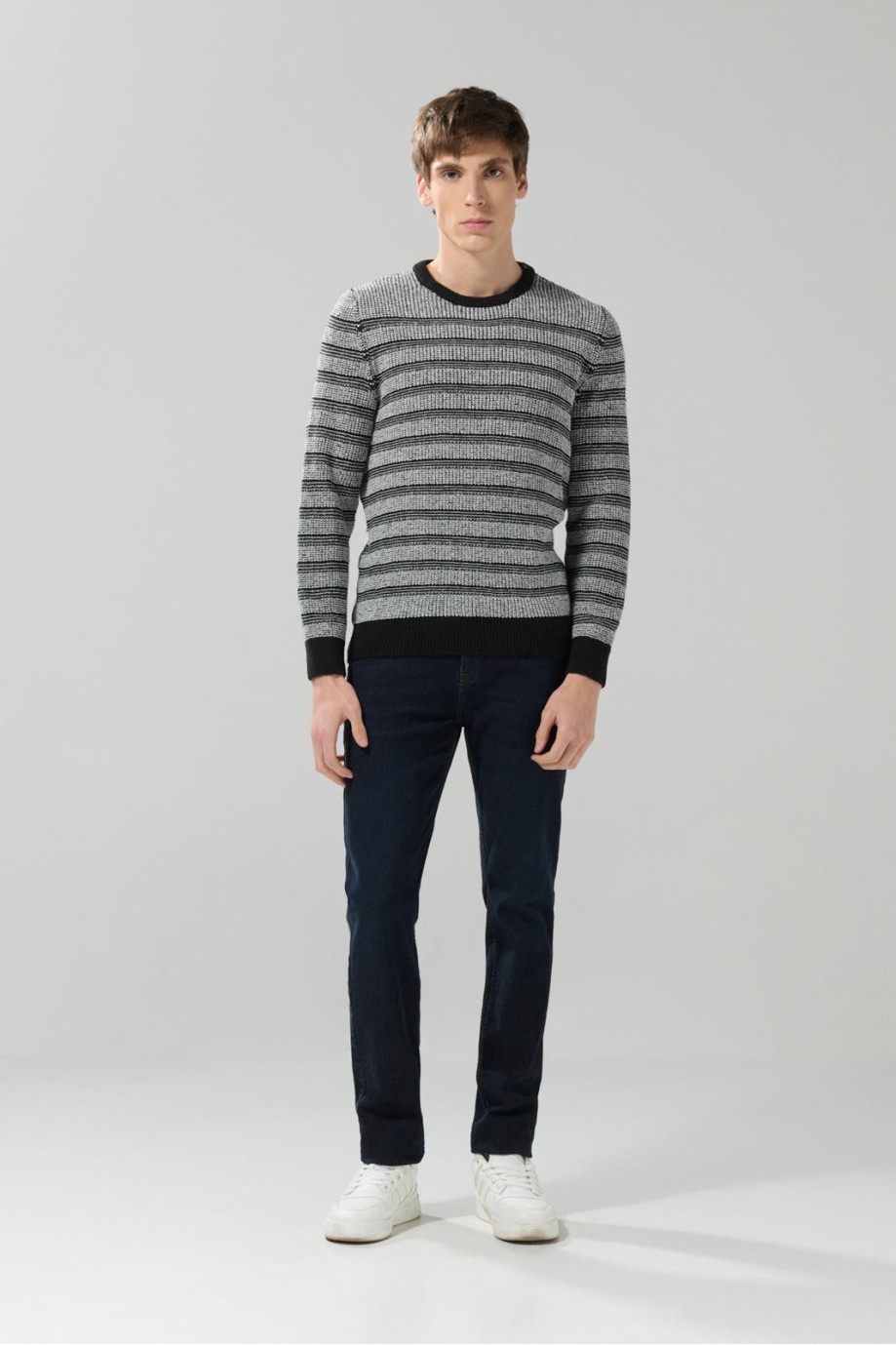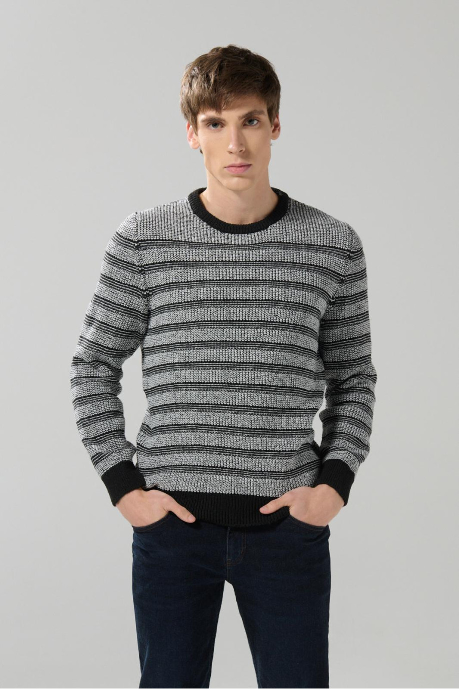 Suéter para hombre en tono unicolor, confeccionado en suave material tejido, cuenta con cuello redondo, diseños de rayas continuas en contraste, manga larga y una silueta ajustada al cuerpo. Esta es una prenda en tendencia perfecta para los planes casuales, con un jean skinny crearás un look con el que te sentirás identificado.