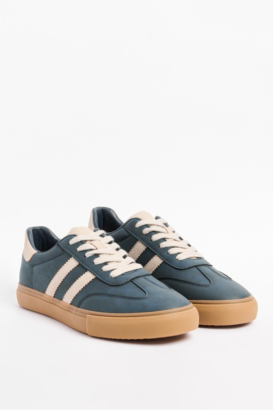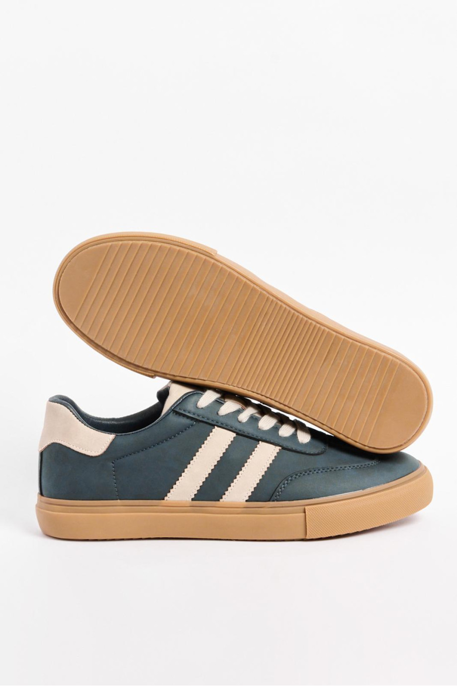 ¡Los tenis urbanos para hombre que necesitas! En color azul oscuro con líneas en contraste color kaki, y una suela plana que destaca. Inspirados en los clásicos de la moda urbana, su estilo atemporal y su silueta fiel al legado de los sneakers hacen que sean perfectos para cualquier ocasión. Con un exterior texturizado discreto y elegante, estos tenis se están convirtiendo en un básico imprescindi