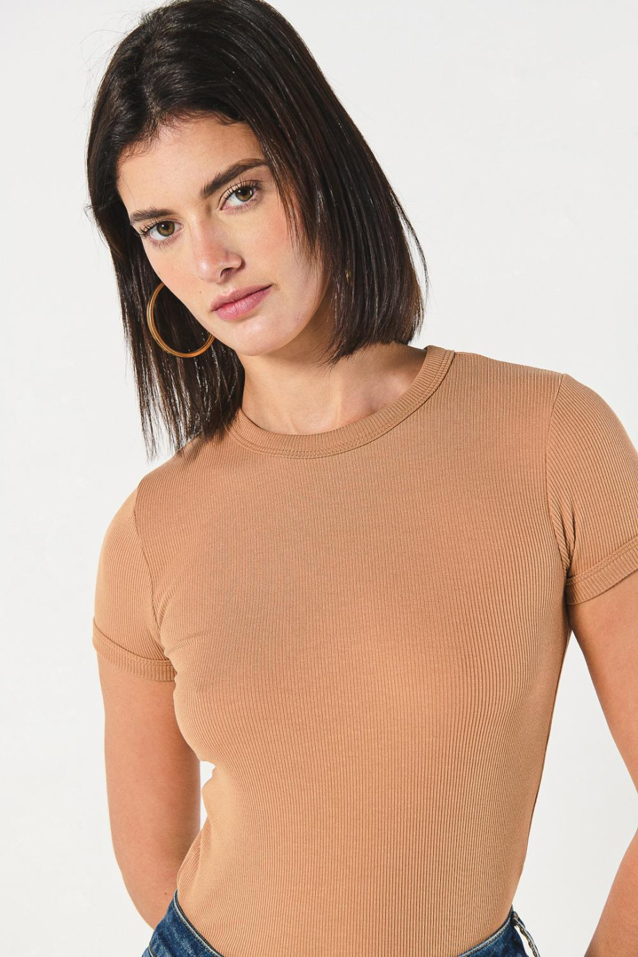 Camiseta unicolor con texturas acanaladas y cuello redondo