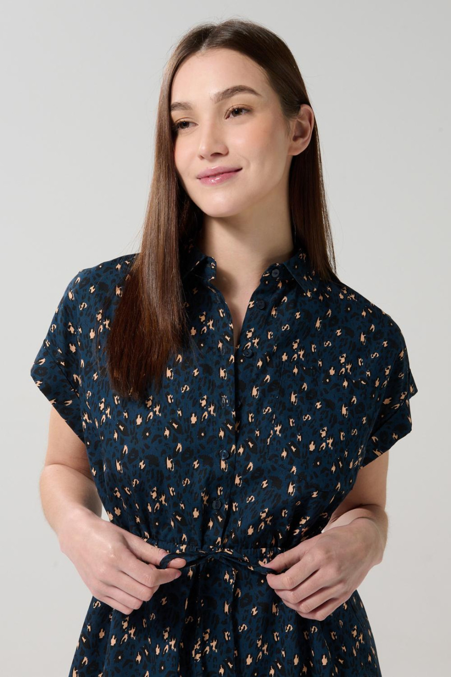 Vestido para mujer corto azul oscuro cuenta con cuello camisero, hombro rodado, manga corta, cierre delantero con botones, bolsillo en frente, cordón en la cintura y un fit ligeramente ajustado. Esta prenda hará un match perfecto con tu estilo, combínala con un par de botines y crea un look con el que te destaques.