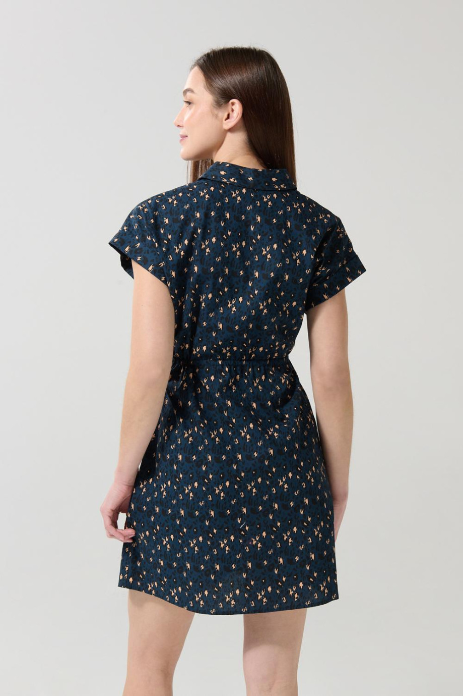Vestido azul oscuro corto estampado con hombro rodado